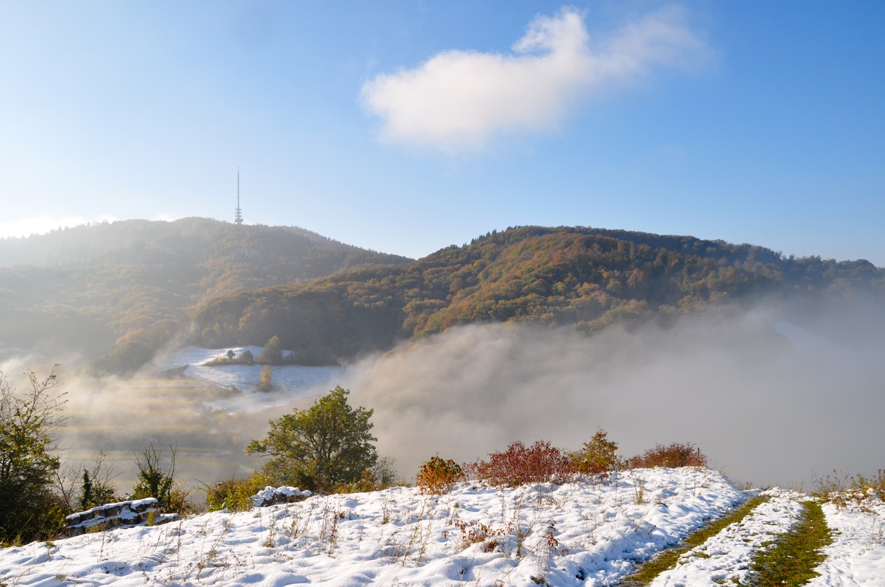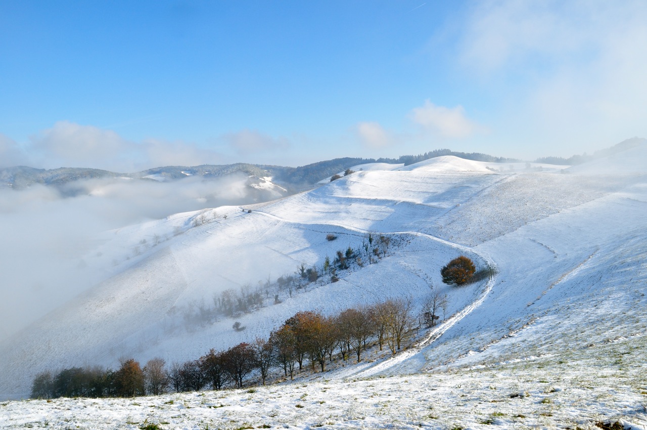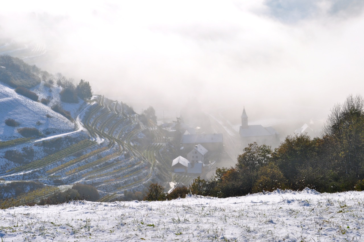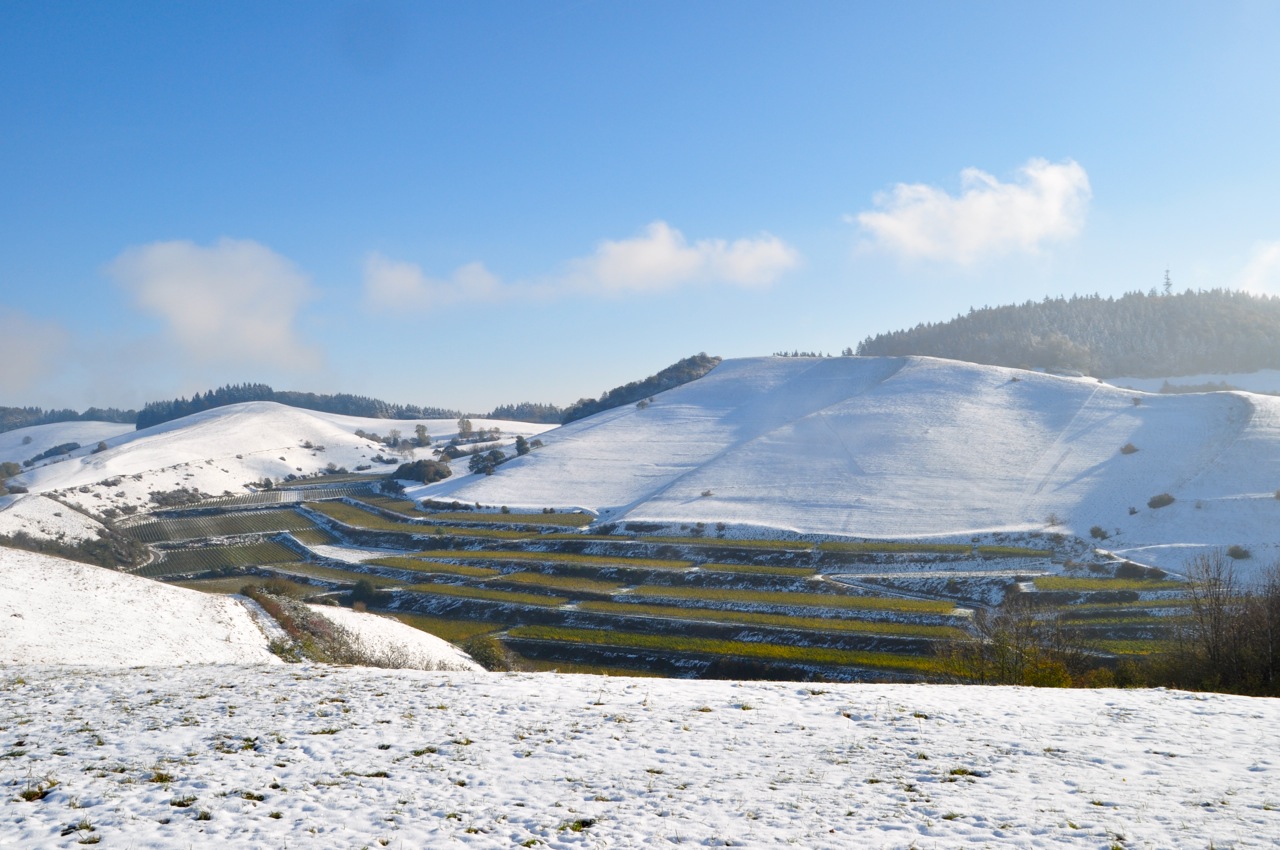 Je vous propose une petite balade dans la réserve naturelle du Badberg, sous un léger manteau de neige, dans le massif du Kaiserstuhl, en Allemagne. Les vignes en terrasse se détachent bien sur la neige.