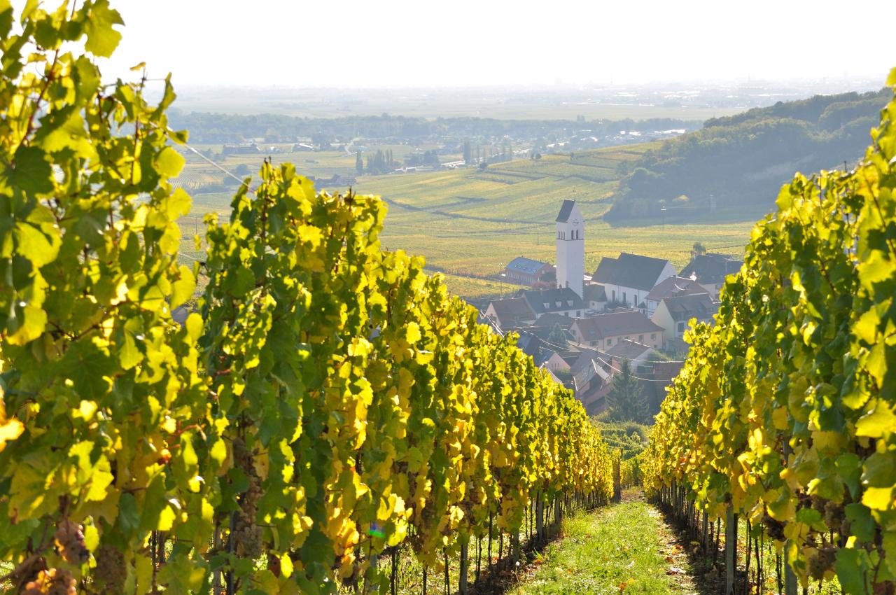Katzenthal et au fond Colmar dans la brume matinale